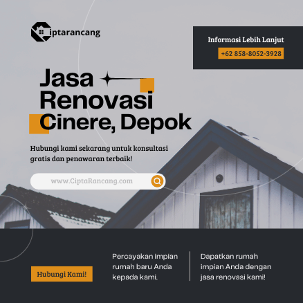 Kalau Bapak/Ibu sedang berencana merenovasi rumah di Cinere, Depok, baik sebagian maupun total, sekarang saatnya wujudkan impian itu bersama Ciptarancang.com — tim profesional yang siap membantu mulai dari desain, perhitungan RAB, hingga pengerjaan yang rapi dan bergaransi.